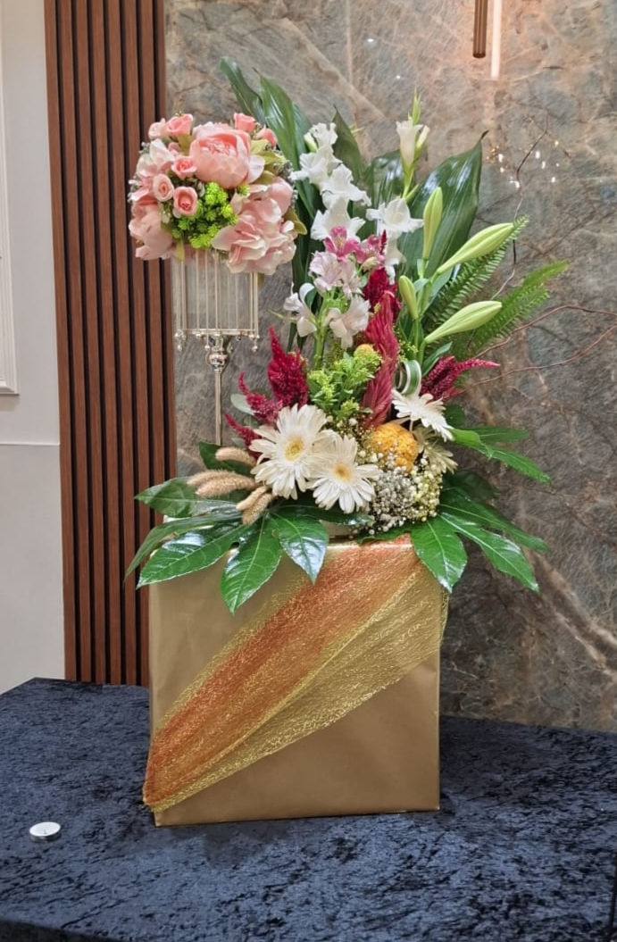 שזירת פרחים חיים ענקית לאירוסין עם שעון משולב